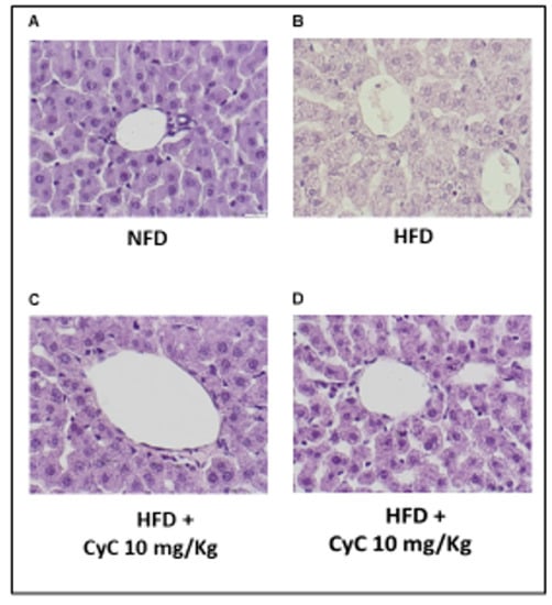 After four weeks of study, histological analysis did not show liver damage in rats receiving normal diet (NFD) (Figure 3A). In contrast, histopathological study of liver parenchyma showed that feeding animals with HFDs induced hepatic steatosis. In particular, HFD-fed rats displayed prominent hepatic steatosis at the end of four weeks of treatments (Figure 3B). In particular, cytoplasmic alterations found in hepatocytes of rats fed a HFD revealed the occurrence of microvesicular steatosis; the cytoplasm had been replaced by bubbles of fat that did not displace the nucleus, while signs of macrovesicular steatosis had not been found. In Figure 3C,D it is shown that CyC (10 mg/kg or 20 mg/kg) supplementation was able to prevent steatosis found in HFD-fed rats at the end of four weeks of treatments.