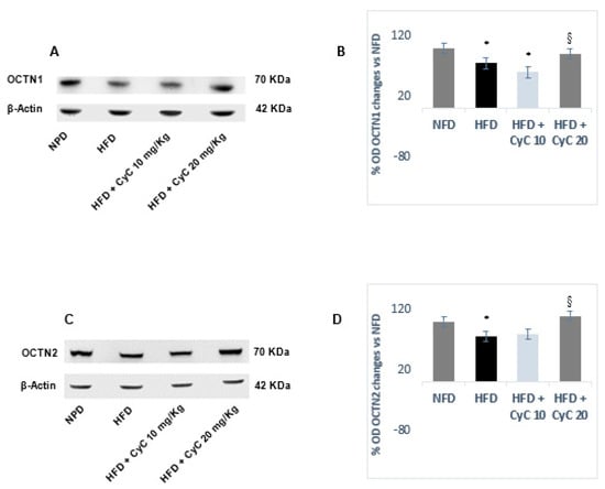 OCTN1 and OCTN2 have been found to be expressed in liver tissue of rats under basal conditions and remained unchanged after feeding rats with NFD over four weeks of treatment (Figure 4). In rats fed a HFD, a significant reduction of both OCTN1 and OCTN 2 expression was found, with the reduction of both transporters being nearly equivalent. Supplementation of rats with CyC restored OCTN1 and OCTN2 expression in liver tissues after four weeks. However, only the dose of 20 mg/kg was found to be effective in restoring completely and significantly OCTN1 and OCTN2 expression in rats fed a HFD (Figure 4). No change was found in OCTN1 and OCTN2 expression in rats fed NFD after receiving supplementation with CyC (10 and 20 mg/Kg daily) for four consecutive weeks.