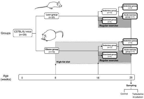 After 10 weeks of the diet protocol, mice from both the lean and obese groups were randomly allocated to either a sedentary or a trained (performing regular exercise) group. The sedentary groups (lean sedentary group n = 14, obese sedentary group n = 13) did not perform regular physical exercise, whereas the exercised groups (lean regular exercise group n = 6, obese regular exercise group n = 6) underwent an 8-week program of regular exercise. Mice were 26 weeks old when the protocol finished. Just before sacrifice, mice from both the lean and obese sedentary groups were randomly allocated to either continuing in the corresponding sedentary group (lean sedentary group n = 9, obese sedentary group n = 8) or an acute exercise group (acute exercise lean group n = 5, acute exercise obese group n = 5). Acute exercise groups performed an acute bout of exercise immediately before sacrifice. Blood collection took place in anaesthetised animals following a 12 h fast. All evaluated parameters were determined in each animal.