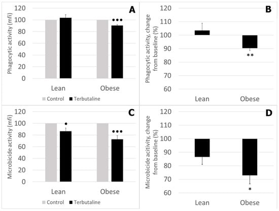 Effect of β2 adrenergic agonist terbutaline on (A,B) phagocytic and (C,D) microbicide activity of circulating monocytes from lean and obese mice, expressed as the percentage change from baseline (giving “100” to control values in the absence of terbutaline). Columns represent the mean ± SEM of independent assays performed in duplicate. * p < 0.05 and ** p < 0.01 vs. corresponding lean value; • p < 0.05 and ●●● p < 0.001 vs. corresponding control value.