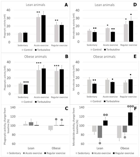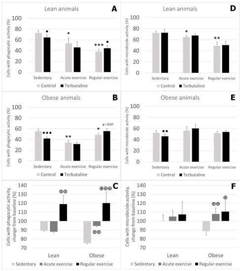 Effect of β2 adrenergic agonist terbutaline on (A–C) phagocytic and (D–F) microbicide activity of circulating monocytes from (A,D) lean and (B,E) obese mice (sedentary, and acute and regular exercise); effect of terbutaline expressed as percentage change from (C,F) baseline, giving “100” to control values in terbutaline absence. Columns represent mean ± SEM of independent assays performed in duplicate. * p < 0.05, ** p < 0.01, and *** p < 0.001 vs. corresponding control sedentary value; • p < 0.05, ●● p < 0.01, and ●●● p < 0.001 vs. corresponding control value; ⊕ p < 0.05, ⊕⊕ p < 0.01, ⊕⊕⊕ p < 0.001 vs. corresponding sedentary value.