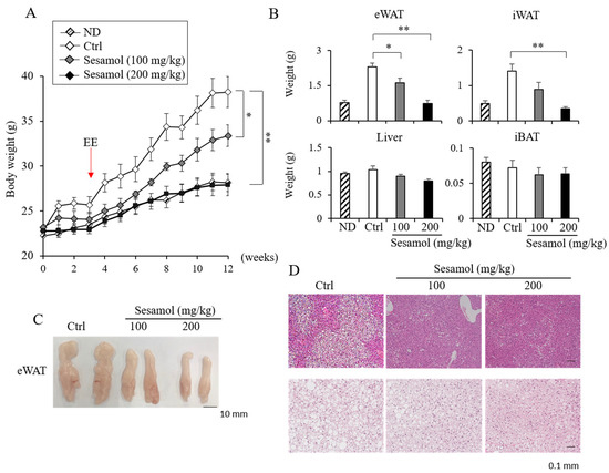 Oral administration of sesamol prevents obesity in high-fat diet (HFD)-induced obese mice. (A) Body weights of vehicle control- or sesamol-treated mice. Eight-week-old male C57BL/6J mice were fed with normal diets (ND) or high-fat diets (HFD, 60% fat) and orally administrated with the vehicle control or sesamol (100 mg/kg and 200 mg/kg per day) up to 12 weeks (n = 5 per group). Energy expenditure (EE) was measured at 3 weeks of treatments. (B) Differences in epididymal white adipose tissue (eWAT), inguinal white adipose tissue (iWAT), liver, and interscapular brown adipose tissue (iBAT) weights in control- and sesamol-treated groups. (C) Representative images of eWAT from control- or sesamol-treated mice. Scale bar, 10 mm. (D) Representative hematoxylin and eosin (H and E) staining for sections of liver and eWAT from HFD-fed mice. Scale bar, 0.1 mm. Data represent mean ± s.e.m. Statistically significant differences between the control- and sesamol-treated mice were determined by Student’s t-test (* p < 0.05; ** p < 0.005).