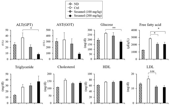 Effects of orally administrated sesamol on serum alanine aminotransferase (ALT; glutamic pyruvic transaminase, GPT), aspartate transaminase (AST; glutamic oxaloacetic transaminase, GOT), glucose and lipid profiles in normal diet (ND)- or high-fat diet (HFD)-fed obese mice. Plasma concentrations of alanine aminotransferase (ALT), aspartate transaminase (AST), glucose, free fatty acids, triglyceride, cholesterol, high-density lipoprotein (HDL), and low-density lipoprotein (LDL) in C57BL/6 mice fed with HFD and administered a daily dose of sesamol at 100 mg/kg or 200 mg/kg (n = 5 per group). Data represent means ± s.e.m. and statistically significant differences between the control- and sesamol-treated mice were determined by Student’s t-test (* p < 0.05; ** p < 0.005).