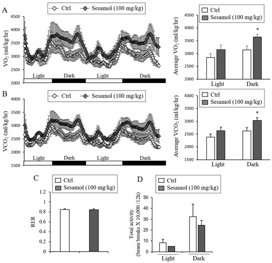 Oral administration of sesamol increases energy expenditure in mice. (A, B) Energy expenditure was evaluated by measurement of oxygen consumption and carbon dioxide production. O2 consumption (A) and CO2 production rates (B) of control- and sesamol-treated mice (100 mg/kg) were measured by indirect calorimetry using CLAMS after 3 weeks on the HFD (n = 5 per group). Energy expenditure was measured at 3 weeks of treatments when body weights did not start to diverge. Bar graph (right panel) represents the average of O2 consumption or CO2 production in each group. (C) Respiratory exchange ratio (RER) of the control- and sesamol-treated mice (n = 5 per group). (D) Total physical activities of control- and sesamol-treated mice (n = 5 per group). Data represent mean ± s.e.m. and statistically significant differences between the control- and sesamol-treated mice were determined by Student’s t-test (* p < 0.05).