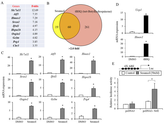 Sesamol stimulates the Nrf2 activation in adipocytes. (A) C3H10T1/2 adipocytes were treated with sesamol (50 μM) for 12 h and the gene expression profiles were analyzed by a microarray analysis. Lists of 10 most highly induced genes (solute carrier family 7 member 11(Slc7a11), activating transcription factor 3 (Atf3), Hmox1, Srxn1, interferon-related developmental regulator 1 (Ifrd1), heat shock protein family a member 1b (Hspa1b), oxidative stress induced growth inhibitor 1 (Osgin1), Gclm, proteoglycan 4 (Prg4), and carbonyl reductase 3 (Cbr3))by sesamol were shown. (B) Expression profiles of C3H10T1/2 adipocytes treated with either sesamol (50 μM) or tert-butylhydroquinone (tBHQ, 50 μM) were compared. Diagram showing the number of genes (>2.0 fold) regulated by sesamol or tBHQ. (C) Expression of sesamol (50 μM)-induced genes in C3H10T1/2 adipocytes were confirmed by real-time PCR. (D) Induction of the Ucp1 and Hmox1 mRNA expressions by tBHQ in C3H10T1/2 adipocytes. (E) HEK293T cells were transfected with the Nrf2-dependent antioxidant response element (ARE) luciferase reporter construct (6XARE) and an expression vector coding for Nrf2 (pcDNA3-Nrf2). After 36 h, cells were treated with DMSO (control) or sesamol for an additional 12 h and the firefly luciferase activity was measured. The firefly luciferase enzyme activity was normalized to the Renilla luciferase enzyme activity. Data are means ± standard deviations (n = 3). Statistical significance was determined by comparison with the control using Student’s t-test (* p < 0.05).