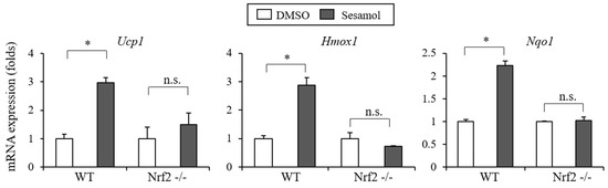 Nrf2 is essential for the sesamol-mediated Ucp1 induction. Induction of Ucp1 and Nrf2 target genes by sesamol was compromised in the absence of the Nrf2 expression. Nrf2 knockout mouse embryonic fibroblasts (Nrf2 KO MEF) or Nrf2 wild type cells (Nrf2 WT) were treated with sesamol for 12 h and relative levels of Ucp1, Hmox1, and Nqo1 were measured by real-time PCR. Data are means ± standard deviations (n = 3). Data represent means ± s.e.m. and are representative of three independent experiments. Statistical significance was determined relative to a control using the Student’s t-test (ns, not significant; * p < 0.05). WT, Nrf2 wild type cells; Nrf2 -/-, Nrf2 KO MEF.