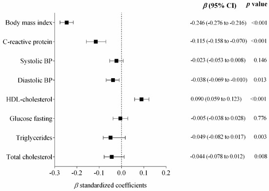 The regression analyses (Figure 1) showed a significant inverse association between cardiorespiratory fitness and BMI (standardized β = −0.246; p < 0.001), high-sensitive CRP (standardized β = −0.115; p < 0.001), Diastolic BP (standardized β = −0.038; p = 0.013), Triglycerides (standardized β = −0.049; p = 0.003) and total cholesterol (standardized β = −0.044; p = 0.008), as well as a direct association with HDL-cholesterol (standardized β = 0.090; p < 0.001), after adjustments for age, sex, pubertal stage and country.