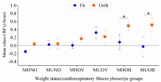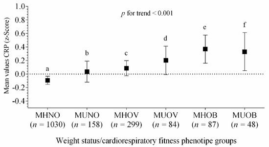 Our study showed that high-sensitive CRP levels elevated linearly across weight status, without significant differences between metabolic phenotypes. Furthermore, these results also suggest that high levels of CRF attenuates the association of CRP levels, particularly with participants within the MHNO, MHOB and MUOB categories. These results add to the findings of the existing literature about the relevance of CRF on inflammation throughout weight status and metabolic phenotypes categories. Moreover, our findings support previous studies which demonstrated that obesity and the metabolic disorders’ risk in children and adolescents are associated with low-grade inflammation, especially on CRP [32,33]. Indeed, CRP has been directly associated with insulin measures, triglyceride, inversely with HDL-c [34] and a metabolic risk score [6].