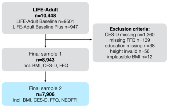 Flowchart of sample selection for sample 1 and sample 2. Abbreviations: BMI = Body-Mass-Index, CES-D = Center of Epidemiological Studies Depression Scale, FFQ = Food Frequency Questionnaire, NEOFFI=NEO Five-Factor-Inventory.