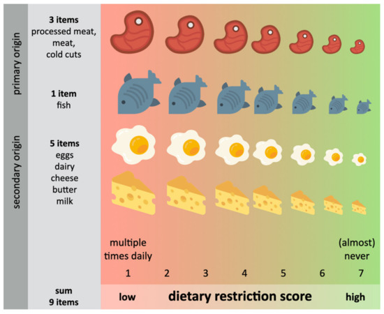 Food group items were taken from a questionnaire asking for self-reported food intake frequency over the last 12 months. A composite score for the restriction of animal-derived food items was calculated (Figure 2), including nine questions regarding the following food groups: meat, processed meat and cold cuts, fish, eggs, dairy (yoghurt and cream cheese), cheese, milk and butter (animal DRS). Answers ranged from multiple times daily (1 per item; 9 for summed score), daily/(almost) daily, multiple times a week, weekly, 2–3 times monthly, 1 or less a month to (almost) never (7 per item; 63 for summed score). The higher the score, the lower the frequency of consumption of animal-based products. Light products were recoded from 1–5 to 1–7, and either the normal or the light product was chosen for scoring depending on higher frequency; if both were equally frequent, the normal item was chosen (applicable for processed meat/cold cuts, dairy, cheese, butter and milk). Measures were ordinal, but for analysis purposes treated as linear, which is a common procedure for scoring lifestyle questionnaire data [35,36] and has been shown to perform robustly in parametric analyses [37]. Note that the questionnaire did not include an option such as “I prefer not to answer” or “I don’t know”. Missing values were replaced by the population mean in line with recommendation to use imputation for missing values in nutritional epidemiology [38]. Subjects with >20% of missing answers out of the 33 food items (excl. drink items) were excluded from the analysis (code and supplementary info available here (https://osf.io/m7hxk/?view_only=91863f44bae44371a1317072334df9fd).