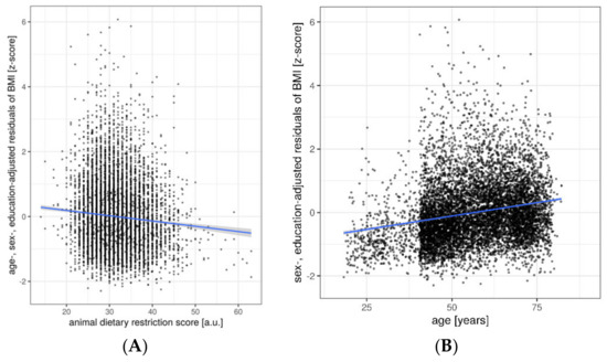 Association between body-mass-index (BMI) and demographic and lifestyle factors (A) animal DRS (B) age, residuals plotted according to regression model 1 (sample 1 n = 8943). Line gives regression fit. Point size = 1. Abbreviations: a.u. = arbitrary units.