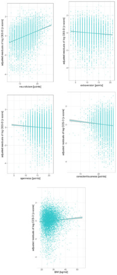 In addition, weight changes relate to depressive symptoms [23], and obesity and depression might share genetic pathways and personality traits, in particular neuroticism [24]. For example, studies showed that higher neuroticism and lower conscientiousness correlate with a higher BMI and more depressive symptoms [25,26]. Moreover, differences in personality traits and in demographic factors such as age, sex and education have been linked to more or less restrictive lifestyle habits, including diet [27,28,29].