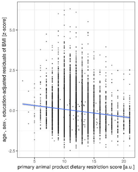 Restrictive animal-based product intake associated with lower BMI. Lines give regression fit. Position size = 1. Abbreviations: a.u. = arbitrary units.