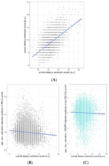 (A) Positive association between decreasing frequency of animal-based products and number of excluded food groups. Negative association between overall dietary restriction score with (B) BMI and (C) CES-D. Position size = 1. Abbreviations: a.u. = arbitrary units. Significant associations (p-values < 0.05) are indicated in bold.