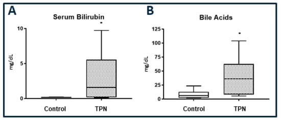 (A): Serum bilirubin. (B) Total serum bile acids. Significantly high serum bilirubin and bile acids levels were found with total parenteral nutrition (TPN) compared to enteral nutrition (control). The figure shows box and whisker plots in which boxes represent the 25–75th percentile, and the center lines represent median values. A pairwise Mann–Whitney U test was conducted to determine the p-value. All tests were two-sided, using a significance level of 0.050.