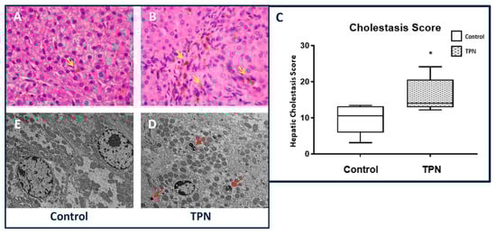 Hepatic cholestasis. (A,B) Hematoxylin and eosin (H&E) stain, 40× magnification showing increased cholestasis in TPN animals (yellow arrows). (C) Cholestasis score was significantly higher with TPN. The figure shows box and whisker plots in which boxes represent the 25–75th percentile, and center lines represent median values. A pairwise Mann–Whitney U test was conducted to determine p-value. All tests were two-sided, using a significance level of 0.05. (D,E) Electron microscopy at 5000× magnification showing bile deposits (red arrows) in TPN-treated animals but not in controls.
