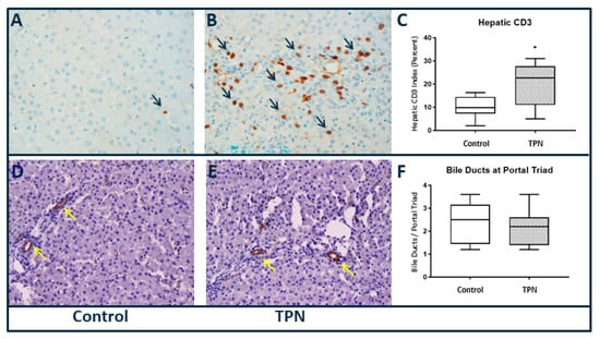 Liver immunohistochemistry, 40× magnification (A–C) cluster of differentiation 3 (CD3) and (D–F) cytokeratin 7 (CK-7). Significantly higher CD3 staining was found with TPN. No differences in CK-7 staining of bile ducts were found. Histology scoring was performed, and a pairwise Mann–Whitney U test was conducted to determine p-value. All tests were two-sided, using a significance level of 0.05.