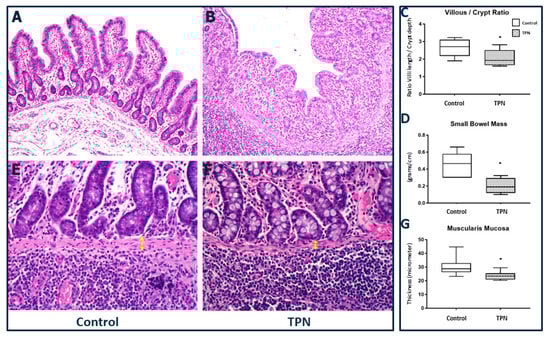 Small bowel histology. (A–C) Villous/crypt ratio (20× magnification). Significant blunting of villi was found with TPN. (D) Gut mass of small bowel was lower with TPN. (E–G) Muscularis mucosa thickness (40× magnification) was decreased in animals treated with TPN (yellow arrows). The figure shows box and whisker plots in which boxes represent the 25–75th percentile and center lines represent median values. A pairwise Mann–Whitney U test was conducted to determine the p-value. All tests were two-sided, using a significance level of 0.05.