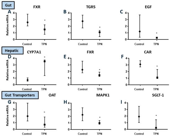 Relative mRNA expression for key bile acid-regulated hepatobiliary receptors and transporters in the gut and liver (A–I). Significant downregulation of gut FXR, TGR5, and EGF, as well as hepatic FXR and CAR in TPN animals. Upregulation of hepatic CyP7A1 was found with TPN. There was significant downregulation of gut OAT, Mitogen-activated protein kinases-1 (MAPK1), and SGLT-1 with TPN. The figures show median and interquartile values. Filled circles represent EN and filled boxes represent TPN. A pairwise Mann–Whitney U test was conducted to determine the p-value. All tests were two-sided, using a significance level of 0.05.