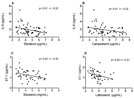 Confirming the beneficial impact of dietary PS, a negative correlation between plasma sterols and inflammatory markers was observed. Pearson’s correlation analyses showed a negative correlation between β-sitosterol and ET-1 plasma concentrations, as well as lathosterol, a marker of cholesterol synthesis, and ET-1 (Figure 1). Although we saw no differences in the concentrations of IL-6 between placebo and PS-treated subjects, a negative correlation was also observed between IL-6 and β-sitosterol and campesterol (Figure 1), confirming the beneficial effects of PS in counteracting inflammation.