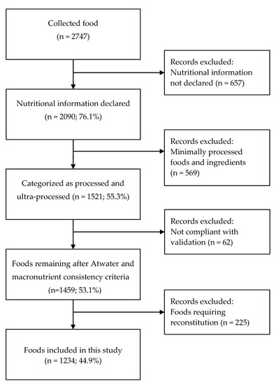 Food packages that did not provide nutritional information, or at least an energy amount (n = 657); and minimally processed food and ingredients (n = 569); and products that did not comply with the Atwater System validation (n = 62) were also excluded. In addition, foods that require reconstitution or preparation before consumption were also excluded (n = 225). According to the front-of-package warning label regulations, these foods must be assessed for front-of-package labels using nutrient values for the food as consumed not as purchased. Many of these foods could not be prepared because reconstitution or preparation instructions were not provided, exact amounts of added ingredients were not stated on the package, the weight or portion size of the prepared product was not available, or the composition of the added ingredient was not available (see Figure 1).