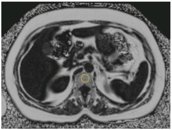 Regions of interest (ROI, 2 cm2) were manually placed in lumbar vertebral body 1 and 2 (anterior part in the medium level) on the proton density fat fraction (PDFF) map [] by using a post-processing software (OsiriX, Pixmeo SARL, Bernex, Switzerland; see Figure 1). The mean value of lumbar vertebral body 1 and 2 was taken. Image analysis was obtained in a blinded manner with independent readers not aware of the study time point or group of each participant. For the placement of the ROI, vessels, lesions, the borders of the vertebral body and surrounding tissue (e.g., muscles, visceral adipose tissue) were avoided. The measurement was taken at the time points of baseline, week 12 and week 50 for each participant in a blinded manner.