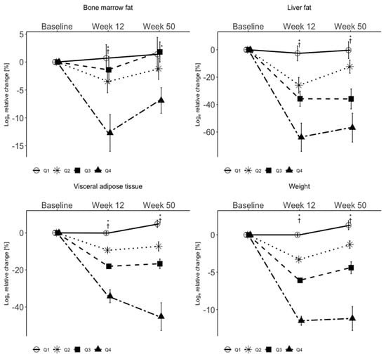 Relative changes of BMFC, LFC, VAT and weight by weight loss quartiles. BMFC, LFC, VAT and weight. Data are shown as mean ± SEM for Log relative change with baseline values as reference. Abbreviations: BMFC, bone marrow fat content; LFC, liver fat content; SEM, standard error of the mean; VAT, visceral adipose tissue; †, significant between the extreme quartiles 1 and 4; *, significant for all quartiles.
