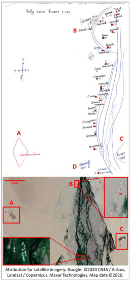 A health officer’s map of rural participant locations juxtaposed with satellite imagery. In rural areas, local health department staff are skilled at locating and tracking surrounding nomadic families, despite their frequent movements. This is exemplified by this map, quickly drafted from memory for the study team’s use by a local health office working in the rural Buyant subdistrict of Khovd province (western Mongolia). The following landmarks can be found in the map and the satellite map of the same study site: A: “Baatarkhairkhan” mountain; B: local administration center, C: “Deer antler” rock formation, D: tourist camp. Attribution for satellite imagery: Google Maps. ©2020 CNES / Airbus, Landsat / Copernicus, Maxar Technologies, Map data ©2020. https://www.google.com/maps/@47.9632414,91.593478,7154a,35y,217.12h/data=!3m1!1e3.