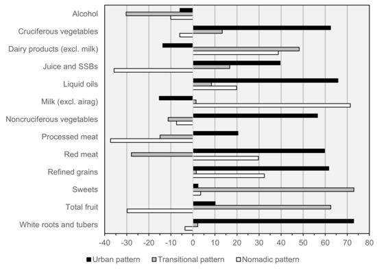 In the present study, three dietary patterns explained 41% variation in consumption of major food groups, and while all were associated with increased energy intake, only the “Urban” pattern was independently associated with increased body mass index. In a prior study, Dugee and colleagues derived three exploratory diet patterns using semiquantitative food frequency questionnaire data collected from 420 healthy men and women aged >25 years from urban and rural areas of Ulaanbaatar and Khuvsgul in August 2005 [46], providing an interesting comparison with Mongolian adults in the present study in 2012–2016. Between 2005 and 2012–2016, pattern factor loadings and the variation in food intake explained by each were closely comparable, except that the 2012–2016 “Transitional” pattern contains high factor loadings for both sweets and SSBs not present in the comparable 2005 “Healthy” pattern. Likely in part due to this difference, only the 2005 “Healthy” pattern, and not its 2012–2016 “Transitional” counterpart, was associated with reduced odds of obesity in energy-adjusted analysis. Both the 2005 study’s “Transitional” pattern and its 2012–2016 “Urban” counterpart were associated with obesity in both unadjusted and energy-adjusted analyses, while the 2005 “Traditional” pattern and its 2012–2016 “Nomadic” counterpart were not, suggesting that diets in urban Mongolia have remained consistently obesogenic, while that of rural areas are not. Furthermore, our finding that adherence to the 2012–2016 “Urban” and “Nomadic” patterns decreases and increases with age, respectively, in both urban and rural areas suggests the possibility that the nation will continue to converge toward an increasingly obesogenic diet in the future.