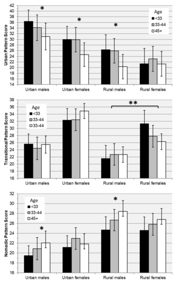 Age-trends in estimated marginal means of diet pattern scores by subgroup. Means are estimated using a regression model in which summer or winter pattern score (n = 635) is predicted using an age group × urbanicity-sex group interaction term adjusted for province, season, within-season mean daily energy intake, and a random intercept per person to account for within-person correlation across seasons. Error bars indicate 95% confidence intervals. * Significant linear trend with age (p < 0.05). ** Significant difference in age trends between rural males and females.