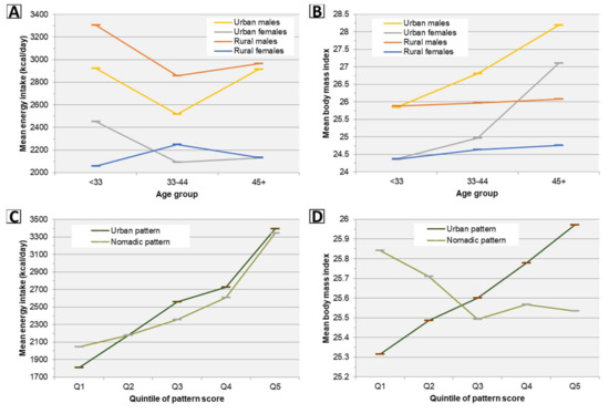 Trends in estimated marginal means of energy intake and body mass index by age and diet pattern scores across subgroups. (A,B) Means are estimated using a regression model in which summer or winter mean energy intake (n = 635) or BMI (n = 334) are predicted using an age group × urbanicity-sex group interaction term adjusted for province; energy models are additionally adjusted for season and a random intercept per person to account for within-person correlation across seasons. Within both urban males and rural males, adjusted energy intake decreases significantly (p < 0.05) from <33 to 33–44 years, and there are no significant differences in linear age trends between any subgroups; see Table 5 for age trends in BMI. (C,D) For each diet pattern, means are estimated using a regression model in which summer or winter mean energy intake (n = 635) or BMI (n = 334) are adjusted for quintile of pattern score, age in years, sex, urbanicity, and province; energy models are additionally adjusted season and a random intercept per person. See Table 9 for trends in energy intake and BMI across quintiles of pattern scores.