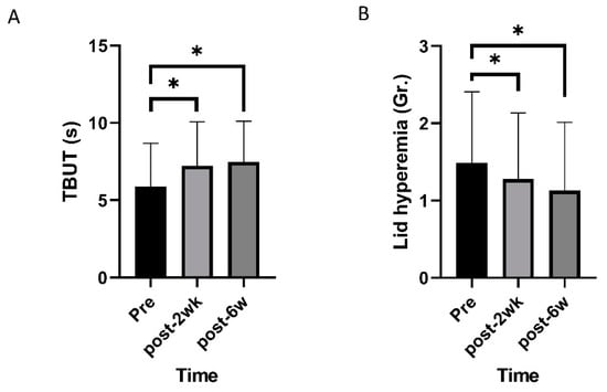 Changes of objective signs of dry eye disease over time. (A) Tear break-up time (TBUT) increased over time. (B) Lid hyperemia grade decreased over time. * statistically significant.