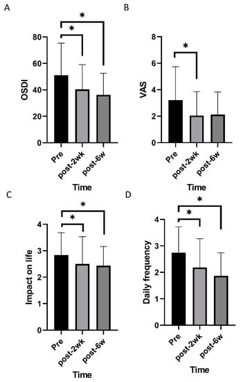 Changes of subjective symptoms of dry eye disease over time. (A,B) Ocular surface disease index (OSDI) and visual analogue pain score (VAS) decreased over time. (C,D) Impact of dry eye symptoms on life and daily frequency of dry eye symptoms decreased over time. * statistically significant.