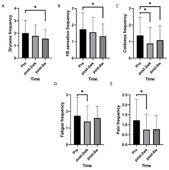 Changes of frequency of individual symptoms over time. (A,B) Frequencies of dryness and foreign body sensation decreased over time. (C–E) Frequencies of coldness, eye fatigue, and pain changed over time. * statistically significant.