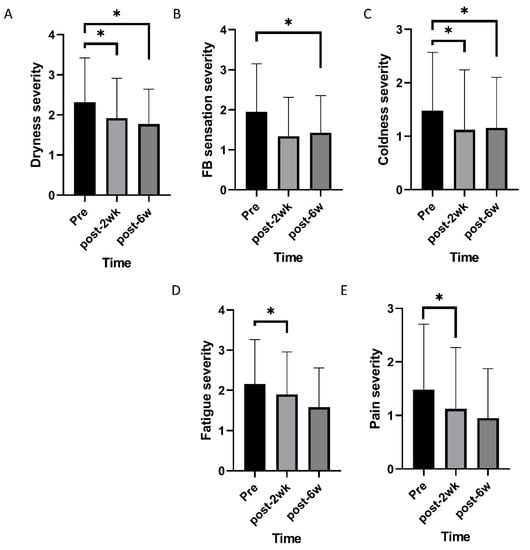 Changes of severity of individual symptoms over time. (A–C) Severity of dryness, foreign body sensation, and coldness decreased over time. (D) Severity of eye fatigue and pain changed over time. * statistically significant.