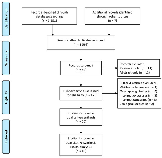 In total 3158 records were identified through database and reference list searches. Due to duplication 1559 records were removed, and then 1530 unrelated records were excluded based on titles and abstracts, leaving sixty-nine records. Applying the inclusion and exclusion criteria, a further eleven reviews and eleven records without full texts available were excluded. After reviewing full texts, one record written in Japanese, four records with overlapping studies, two ecological studies, three records with changes of brain structure or β-amyloid (Aβ) deposit as outcomes, and eight records combining meat, fish, and other food together as exposures were excluded, including one paper with an unclear description on meat by Heys et al. (2010) [23] without any reply from two authors contacted. Therefore, twenty-nine eligible records were included in the review: twelve cohort [9,10,11,24,25,26,27,28,29,30,31,32], three case-control [33,34,35], thirteen cross-sectional studies [36,37,38,39,40,41,42,43,44,45,46,47,48], and one intervention study [49] (Figure 1).