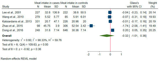 Forest plot of studies with continuous amounts of meat consumed between cases with cognitive impairment and controls for meta-analysis.