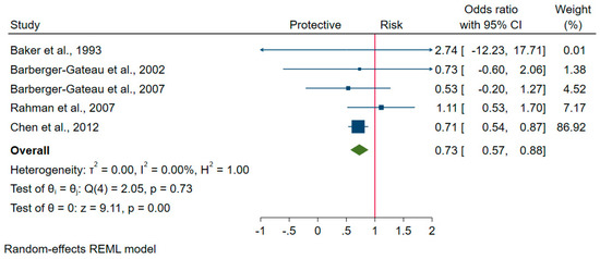 There were five studies with OR values of those who consumed any-type meat (fish not included) weekly or more (that is, ‘always’) vs. less frequently (‘not always’) in cases diagnosed with cognitive disorders compared to controls; four reported consuming meat (e.g., beef/pork/lamb) weekly or more vs. less frequently [24,25,33,38], and one reported ‘always’ vs. ‘not always’ intake of meat [10]. In terms of study design and case definition, four studies comprising two cohort [24,25], one case-control [33], and one cross-sectional [38] study reported AD as cognitive disorders, while one study reporting cases diagnosed with cognitive decline was cohort [10,26,32]. The meta-analysis shows that people with cognitive disorders were 27% less likely than controls to consume meat weekly or more (overall pooled OR = 0.73, 95% CI: 0.57, 0.88) (Figure 3). Heterogeneity is not detected (I2 = 0%). Visual inspection of the contour-enhanced funnel plot shown in Supplementary Figure S2 suggests there was a potential publication bias. The quantitative assessment by Egger’s regression test shows no significant presence of small-study effects (P = 0.63).