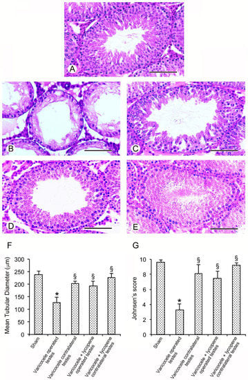 - Abdel-Dayem, M.M. Histological and immunohistochemical changes in the adult rat testes after left experimental varicocele and possible protective effects of resveratrol. Egypt J. Histol. 2009, 32, 81–90. [Google Scholar]