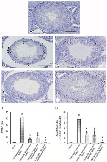 - Ozturk, M.I.; Koca, O.; Keles, M.O.; Haklar, G.; Baykan, O.; Ercan, F.; Tok, O.E.; Karaman, M.I. The impact of unilateral experimental rat varicocele model on testicular histopathology, Leydig cell counts, and intratesticular testosterone levels of both testes. Urol. J. 2013, 10, 973–980. [Google Scholar] [CrossRef]