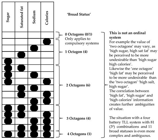 Binary FoP labels are the closest approach to the nominal cue format that forms the basis of commercial food branding and marketing communication practice [24]. However, it should be noted that using multiple warning labels destroys this binary status, and introduces a level of complexity that increases exponentially with the number of labels used. The four octagon Chilean system for example has 16 possible combinations arranged in five broad statuses with zero to four octagons. However, as each ‘state’ comprises multiple combinations of octagons of indeterminate relative value, the system cannot be described as ordinal (Figure 2).