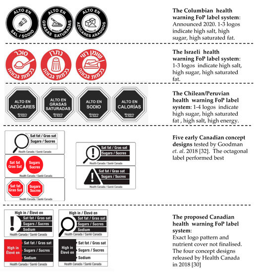 - Troitino, C. Canada’s Proposed Front-Of-Package Nutrition Labels Take Aim At Saturated Fat, Sugar And Sodium. Forbes. 2018. Available online: https://www.forbes.com/sites/christinatroitino/2018/02/20/canadas-proposed-front-of-package-nutrition-labels-take-aim-at-saturated-fat-sugar-and-sodium/#cce543e499a1 (accessed on 22 May 2020).