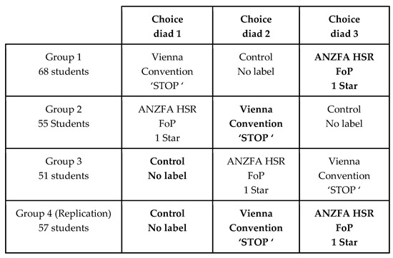 The experimental design was a 3 × 4 fractionally replicated Latin square design after Youden and Hunter (Figure 4) [55,56,57,58,59]. This design delivers a very high level of statistical efficiency, and allows for the main effects of a single independent variable of interest (the FoP label treatments) to be studied while controlling for the main effects of two other unavoidable extraneous variables. These extraneous variables were the cold cereal products on which the FoP labels were presented, and the student groups. The fractional replication (shown as bolded text in the cells in Figure 4) allowed the researchers to estimate the degree of non-additivity (interaction) between the main effects of the three variables [60].