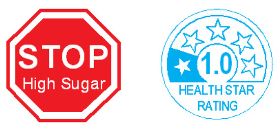 The HSR system has been deployed in New Zealand for nearly five years, with considerable government and business support aimed at creating community awareness and association of the label and its message [38]. It thus represented an appropriate benchmark for the VCSTOP format. The development and deployment of the HSR has also been addressed by a considerable body of published research. The results of this research have been inconclusive with regards to its capacity to influence consumer choice [2,38,39], although some impact upon producer behavior has been noted [40]. The system has attracted criticism with regard to the algorithm that drives its 1-5-star nutritional rating, which is particularly insensitive to high sugar levels [41]. A formal five year review in the HSR was published in 2019, which recommended a continuation of the system, but not a move to compulsion [42], which makes a comparative examination of its performance against a warning label relevant. Recent Australian research using a complex and novel warning label indicated that even this unknown format outperformed the established HSR in influencing consumer choice [43]. However, on the basis of the more developed Canadian warning label research [30], the researchers chose to use the VCSTOP design in this research.