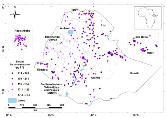 Ethiopia is located towards the Northern end of the East African Rift Valley. Within the Rift Valley, there are Holocene and active volcanoes which have discharged volcanic ash, lava and gases contributing to the formation of fertile volcanic soils, including with high concentrations of plant-available Se []. There are different pathways for volcanic activity to impact Se status: intake by drinking water and food. Drinking water and food are considered the most vital sources of trace elements for humans []. Another important geographical feature affecting Se status may be the Rift Valley lakes, which in Ethiopia include the Abaya, Chamo, Zeway, Shala, Koka, Langano, Abijatta and Hawassa Lakes. It is likely that the consumption of fish—which is a good dietary source of Se—is greater among groups living near to these lakes, as was noted previously in Malawi [].