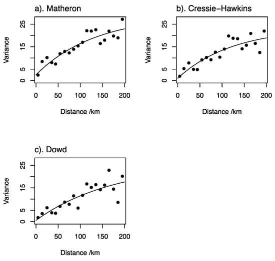 - Cressie, N.; Hawkins, D.M. Robust estimation of the variogram. Math. Geol. 1980, 12, 115–125. [Google Scholar] [CrossRef]