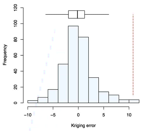 Histogram of the cross-validation errors using the variogram fitted to estimates obtained with the Matheron estimator []. The Box-plot shows the median and quartiles (box limits). The vertical dashed line shows the outer fence values of Tukey [].