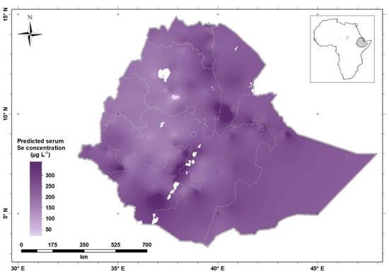 Selenium plays its biological role mediated through several selenoproteins, including glutathione peroxidases (GPx), iodothyronine deiodinases (IDI), Selenoprotein P, etc. We defined Se deficiency using a threshold serum Se concentration <70 µg L−1, as used previously, including for children in Ethiopia [,,]. In the geostatistical analysis in this study, we used thresholds based on the optimal expression of two selenoproteins, GPx3 and IDI, based on Thomson []. Thus, the GPx3 threshold was the mid-point between 1.00 and 1.15 µmol Se/L, as used by Phiri et al. (2019) []. Due to differences between demographic groups in the amount of Se needed for biosynthesis and the expression of selenoproteins, it may be appropriate to apply different thresholds of deficiency to specific demographic groups [,]. Furthermore, higher thresholds of concentration may be appropriate among adults, given the potential protective effect of Se against cancer observed in the USA [] and Europe []. However, until further evidence is available to support the determination of age- and sex-specific cut-offs, there is a need to interpret reported prevalence of deficiency with caution—it may be substantially greater. However, it should also be noted that Se is a negative acute phase reactant, meaning that its concentration in serum is suppressed during inflammation [], so applications of thresholds derived from Western populations may not be appropriate.