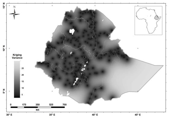 Interpolation error is inevitable because of the spatial variation of our target variable, and the fact that predictions are made from sparse observations. The kriging variance (Figure 6) allows us to visualize this uncertainty. In particular, it is apparent that there is greater uncertainty in the Eastern part of the country, because of the very sparse distribution of observations []. In these circumstances the predicted value tends to the mean of the observations, and the kriging variance is large. If decisions must be made in regions where the kriging variance is large, then local sampling would be essential. However, this might be true of locations in the West of the country for a variable which shows spatial dependence only over very short distances (e.g., tens of kilometers). Examining the kriging variance allows us to avoid arbitrary decisions as to where spatial prediction is reliable from a particular distribution of observations. We consider the implications of prediction uncertainty further below, but first we examine the general spatial variation revealed by the kriging predictions.