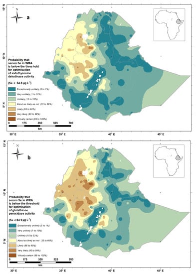 From the probability maps (Figure 7a,b), we can see that WRA in large parts of Western Ethiopia are ‘likely’ through to ‘virtually certain’ to have deficient Se status, leading to impaired GPx3 and IDI activity, with implications for antioxidant and thyroid functions, respectively. Deficiency is also ‘likely’ or ‘very likely’ in the Bale Zone to the east of the Rift Valley. Along the Rift Valley and in large parts of Tigray (North-East Ethiopia), Eastern and Southern Ethiopia, WRA are ‘unlikely’ through to ‘exceptionally unlikely’ to be Se deficient.